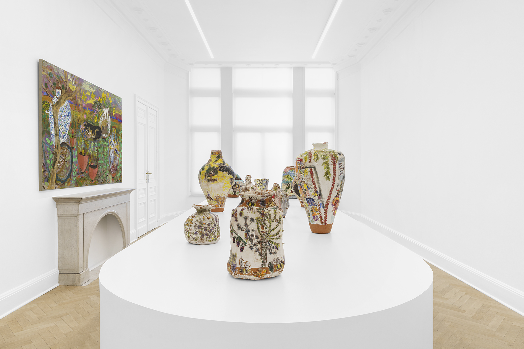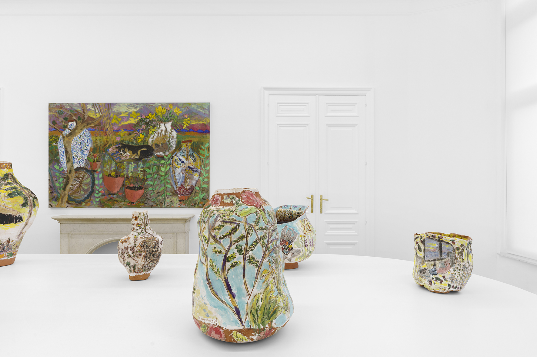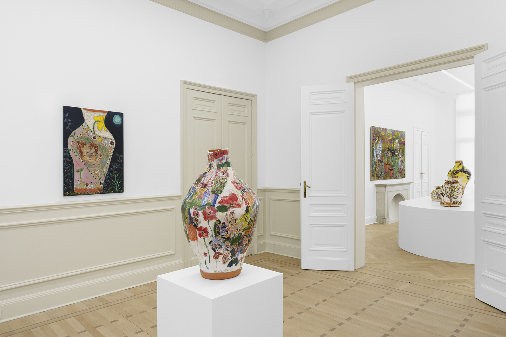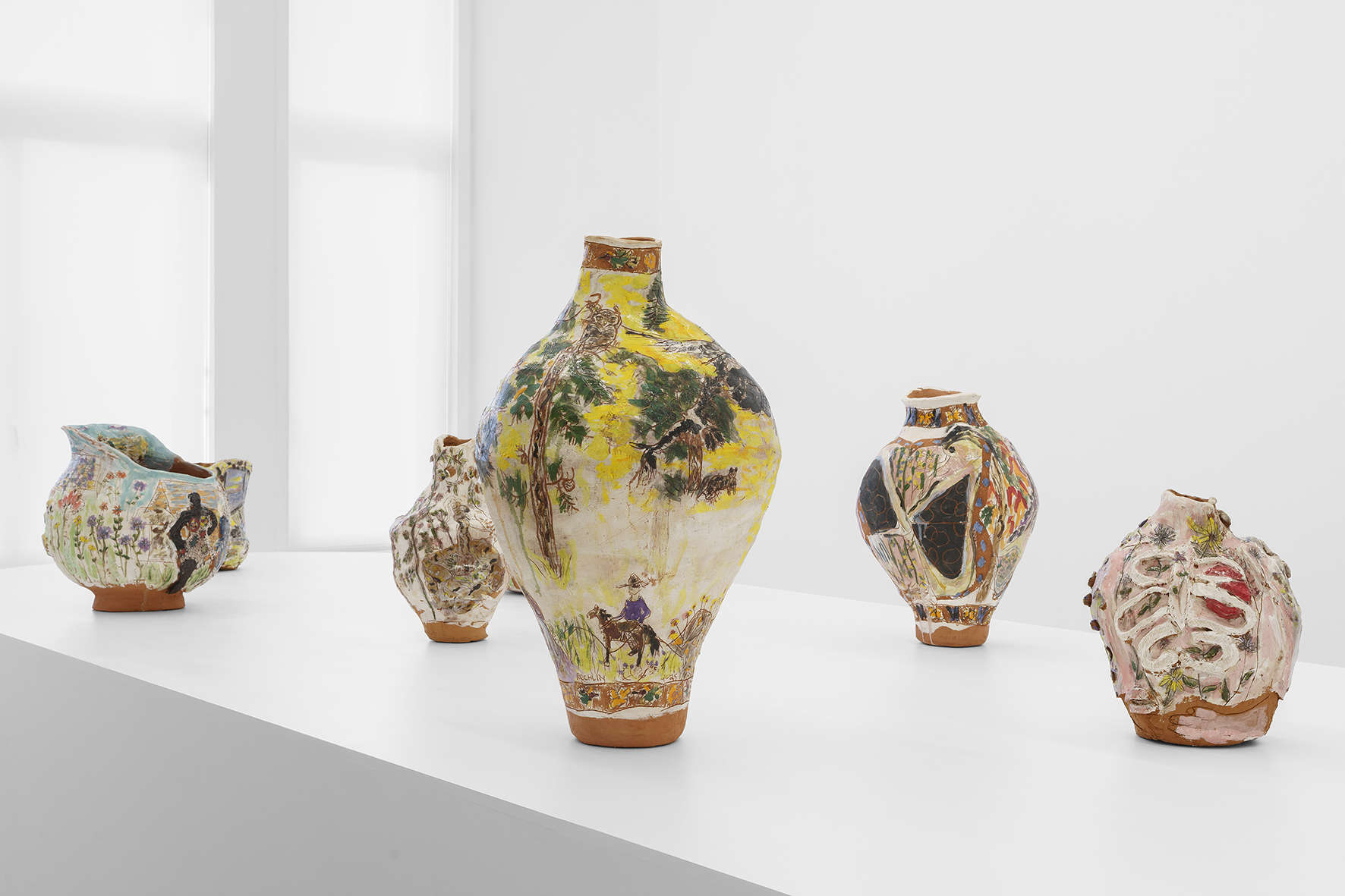 While in Somerset, Rochlin also turned to plein air drawing, painting the surrounding flowers directly onto her pots. These works incorporate references to the exuberant sculptures of Niki de Saint Phalle, whose colorful, jubilant forms add a note of imaginative freedom to Rochlin’s ongoing narrative of vulnerability and strength.